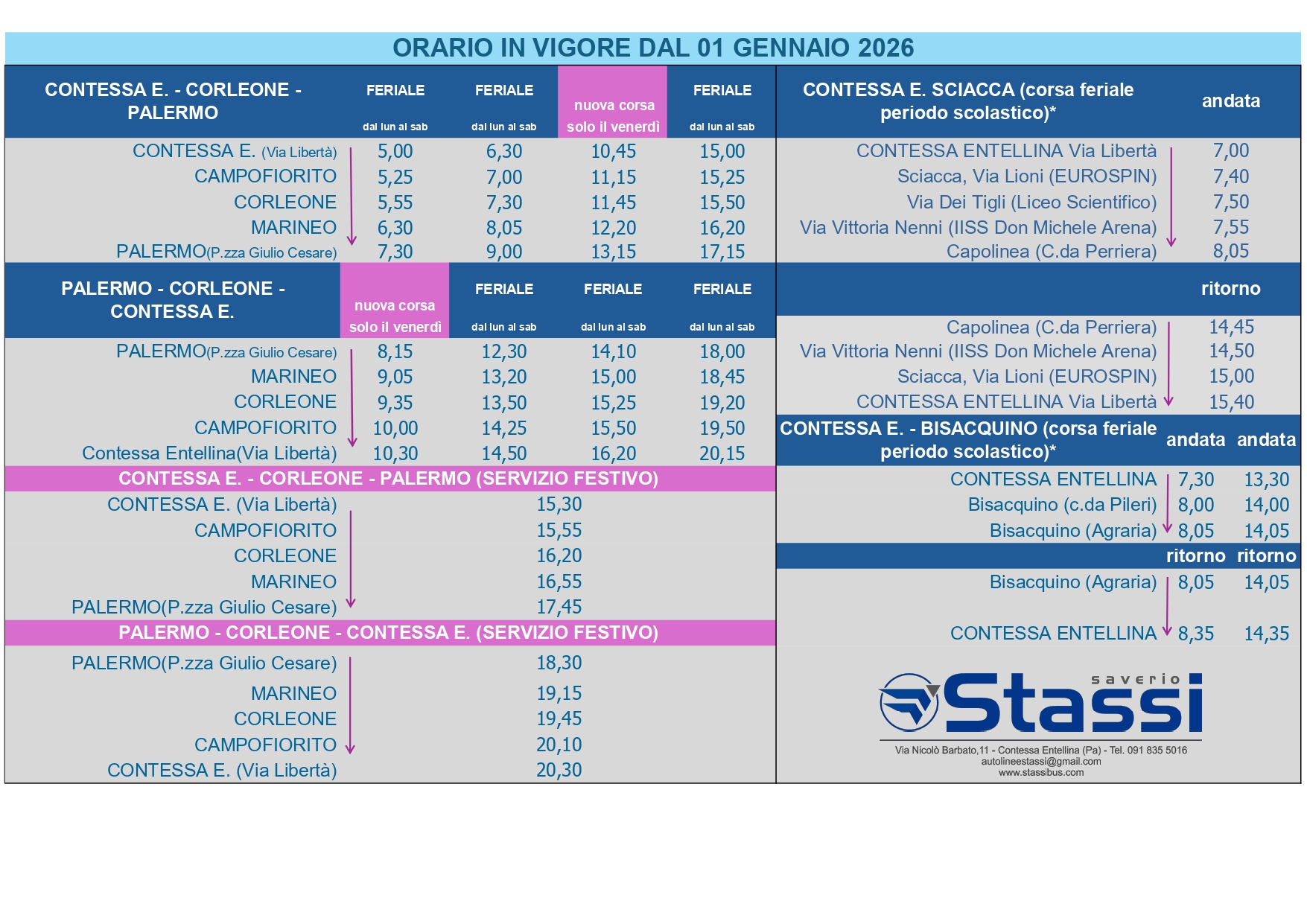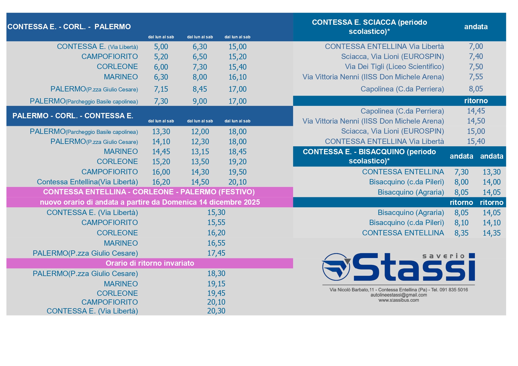 L’azienda Stassi Saverio snc con le sue linee di trasporto pubblico extraurbano Contessa Entellina-Corleone-Palermo, Contessa Entellina-Sciacca (Scolastica), Contessa Entellina-Bisacquino (Scolastica) è lieta di presentare la nuova edizione della Carta di Servizi, per promuovere l’utilizzo ed il miglioramento del servizi di trasporto pubblico locale.